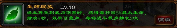 生命绽放是一项回复型技能,当技能升至满级后,主将在受到武力伤害时,将获得每秒回复自身5%最大生命值的效果,该效果持续5秒。此技能在每场战斗中最多可触发两次。从效果来看,它相当于为武将间接提升了25%的血量上限,但由于仅对武力伤害生效,因此面对智将时无法发挥作用,通常需要被小兵攻击后才能触发。不过,该技能适用的战斗场合较为广泛,属于实用性较强的万金油技能。