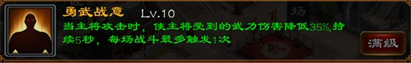 勇武战意属于削弱类技能,是削弱型武将的代表性技能。不过在游戏后期,武力属性除了对关羽和孟获比较重要外,对其他武将来说并不关键,因此削弱武力的效果有限,不建议把技能点投入到这个技能上。