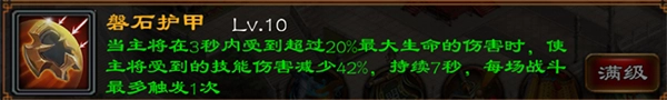 磐石护甲是一个防守类技能,其满级效果为:当主将在3秒内承受的伤害超过自身生命值的20%时,可使主将接下来受到的技能伤害降低42%,该效果持续7秒。不过需要注意的是,触发该效果的那一次超过20%的伤害并不包含在技能伤害减免的范围内,因此这个技能无法抵御秒杀型技能——即便主将在承受秒杀技能后没有直接阵亡,剩余生命值也所剩无几了。综合来看,磐石护甲的实际实用性并不高。