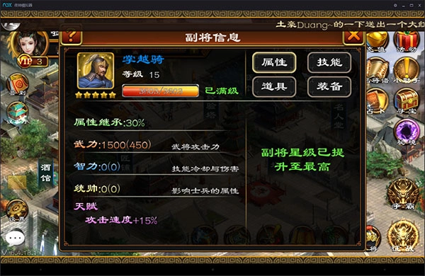 掌越骑属于蓝色品级的副将,当他达到满星状态后,能为主将提供450点武力加成以及15%的攻击速度提升。不过在属性加成方面,和前面提到的两位副将相比,他的加成效果要略微低一些。