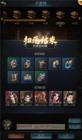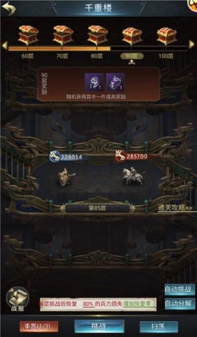 千重楼是凝聚鲁班智慧打造的机关楼阁,挑战它既能展现你麾下军队的实力,也能检验你在排兵布阵上的智谋。通关这个副本不仅可以获取海量的武将经验,还能得到丰厚的道具奖励,因此它是每日必做的副本之一。