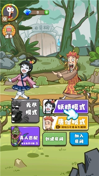 5个白骨精合伙去抓唐僧,谁知道唐僧武力值爆表,把这群妖怪都打伤了。实在没办法,白骨精们只好逃到旁边的山洞里,喊来同伴帮忙抵挡唐僧的攻击,还得赶紧造出月光宝盒好逃出去。