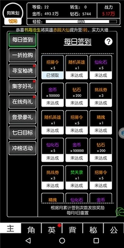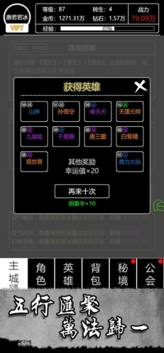 1、进入游戏后,先完成两个主线任务,然后去领取各类礼包兑换码和登录奖励,此时就可以开始刷开局号了。建议最好刷出3个及以上橙色英雄,若运气实在不佳,至少也要有2个橙色英雄(虽然两个英雄推图会比较吃力,但50级前基本没问题)。接下来开始培养英雄,把招募到的橙色英雄都升到50级并穿上装备,之后就能一路推图到高老庄(到达高老庄时主角等级大概在50级左右,此时主城功能会全部开启)。之后点击主城,领取推图奖励、主线奖励以及升级奖励,再点击左上角即可。