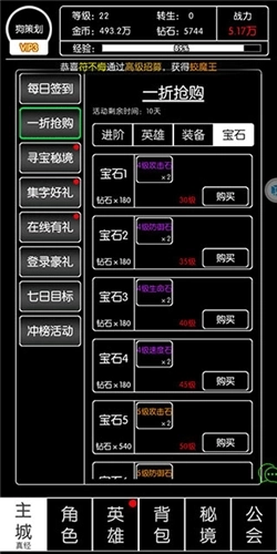 2、领取完毕后,点击“一折抢购”将进阶经验丹全部购买,随后在英雄选项中购买至英雄4,宝石也全部购入(此时你会发现自己的VIP等级升至3级,VIP等级是通过消耗钻石提升的;接着把VIP礼包全部买了,这里推荐购买V7以前的礼包,V7之后的礼包性价比相对不高,可根据个人情况选择)。现在我们差不多又有40多个招募令,只要运气不算太差,凑齐5个橙色英雄是没问题的(橙色英雄分4技英雄和3技英雄,现在就可以开始培养4技英雄,3技英雄可以直接放弃,拿去炼妖台转换为其他橙色英雄)。