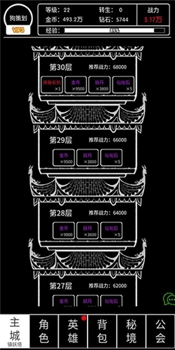 3、将购买的宝石和装备全部更换完毕后,点击主城的镇妖塔开始闯塔挑战(镇妖塔每5层的奖励十分丰厚,招募令、橙色英雄、极品装备等珍稀道具均出自此处)。