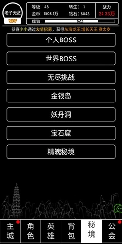6、公会捐献建议选择金币捐献和100钻石捐献,所得贡献可在公会仓库兑换心仪的装备与材料(橙色英雄转换的灵符、女娲石在仓库里兑换格外划算)。之后有空可以留意公会BOSS的血量,找准时机“截胡”最后一击,奖励的装备通常都是极品(不过要小心别被会长踢掉)。完成这些后继续推进关卡,有时间还能点击主城右上角观看视频(每天限30次,每次间隔3分钟,随机掉落妖丹、钻石等道具);若想快速获取经验,可点击炼丹炉碰运气,运气好的话能拿到几百万经验,获得经验后就可以重点培养主力英雄了。