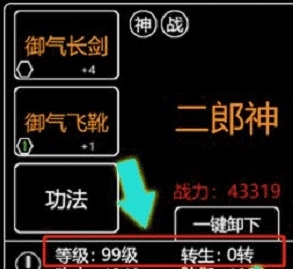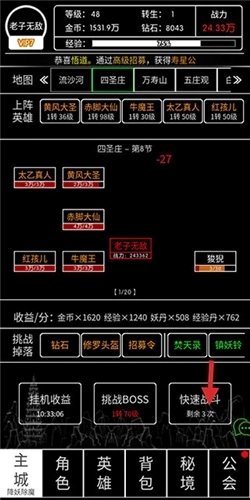 4、直接闯塔到30层就停下,后面的关卡难度较高,我们把闯塔获得的红色装备分配给优先培养的英雄(这里说明下优先培养的英雄选择:容易招募到的红孩儿、牛魔王、太乙真人、赤脚大仙、黄风大圣等四技能英雄,因为后期一转时必须拥有相同英雄才能完成转生),之后再用闯塔得到的仙化石对角色进行属性提升。