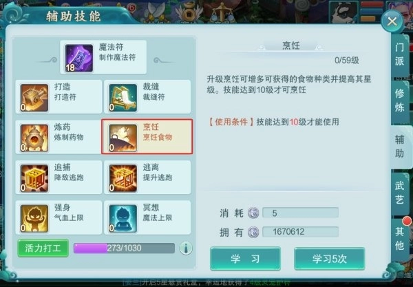 烹饪属于辅助技能的一种。烹饪技能的等级越高,能制作的烹饪品类就越丰富,做出的烹饪品质也会更好,而用不完的烹饪物品还能通过摆摊卖给其他玩家来换取银币。