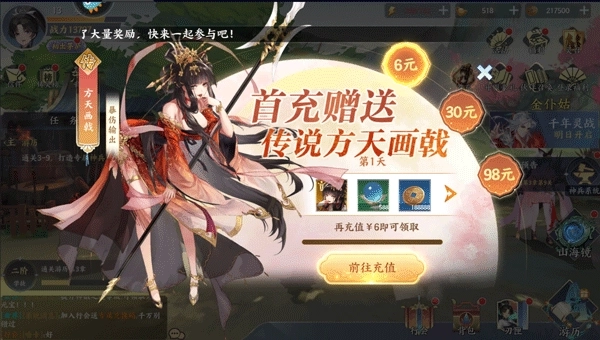 4、首充建议选择每日特惠礼包,可获得强大的传说刃灵-方天画戟,全体超高暴击和爆伤输出,可在前期快速压低敌方血线,更快的推进关卡
