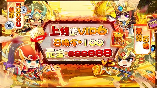 上线福利:创角即享VIP6、888888元宝、100召唤令、1000突破石、1000初级武将精华、800飞升丹、800时装精华(通过邮件领取),还有5000万银币!更有高级百抽创角即送,助你强势出征!