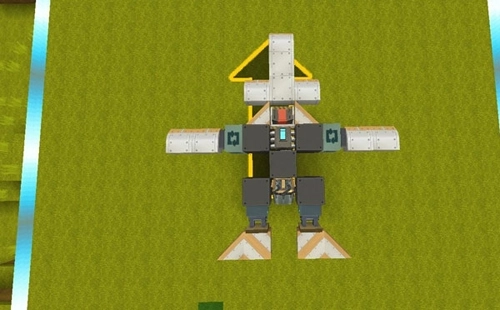 4、随后我们在驾驶座后方放置无限引擎,并在引擎两侧安装转轴方块与机翼: