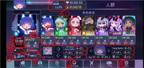 ①:点击不同人物,可查看该角色的当前等级(斜杠左侧)以及当前可提升至的最高等级(斜杠右侧)。