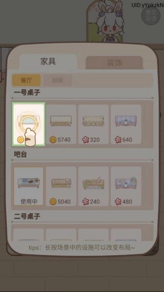 4、在“设施”界面中,餐厅和厨房各自对应着不同的可解锁家具与装饰;通过努力获取更多金币来装扮旅店,能让客人给出更高的评分。