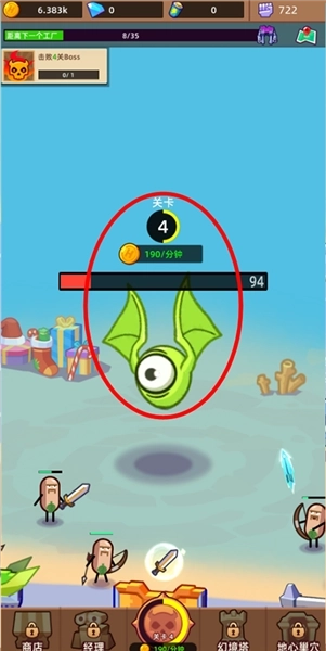 每个游戏关卡里都设有一个boss,玩家得借助自己打造的英雄去击败这些boss,完成这一步后就能拿到金币奖励。这些金币奖励,玩家可以用来建设工厂,也能用于英雄的升级。
