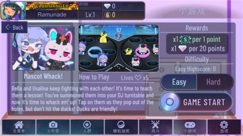 这个小游戏采用类似打地鼠的模式,Bella和Usalina会从界面里DJ工作台左右两个碟子的6个孔中冒出来,其中还夹杂着鸭子。