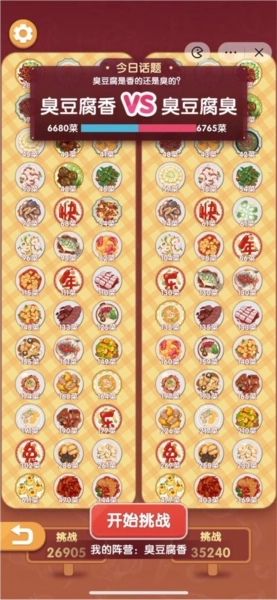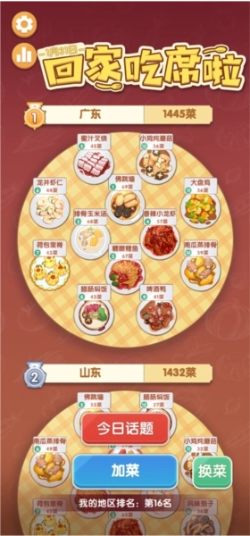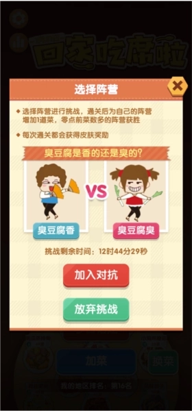 7、接着点击“今日话题”,玩家可在此选择阵营参与挑战。通关后能为所属阵营增添1道菜,零点前菜量较多的阵营将赢得胜利,而且每次通关都会获得皮肤奖励,现在我们点击“加入对抗”按钮。