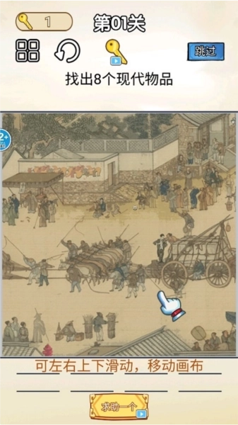 1、游戏的任务是在古图里找出所有现代物品,就像图中展示的那样,通过左右上下滑动能够移动画布。