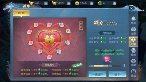 4.心锁:消耗三生石可以获得心锁经验,心锁经验到一定值后同心锁会升级,升级后的同心锁会有更高属性加成;