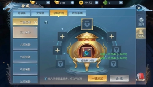 3.项链护符、戒指手镯和其他装备不是同一个合成体系,比如下图的就是其他装备合成体系,可以丢5个装备进去,丢进去的装备越多成功率就越高。合成失败的装备会变成残旧的装备,依旧可以进行合成,只不过成功率会低一些。