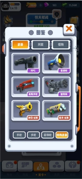 几十种枪械属性各异,灵活使用应对不同场景。还有加特林、火箭筒等强力武器等你解锁。