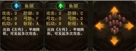 阵形:锥形阵(1阶)、偃月阵(1阶)、鹤翼阵(1阶)、鱼丽阵(1阶)