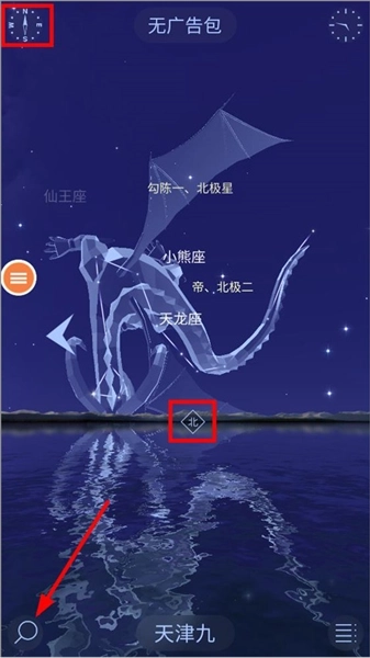 1、启动星空漫步2应用,进入主界面后,页面会呈现当前所在位置对应的星座,在界面左上角根据提示找到指南针方向,接着点击左下角的搜索按钮。