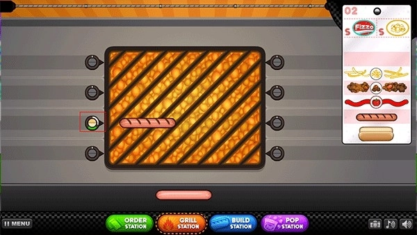 制作热狗的第一步是烤香肠,玩家需要在烧烤站台按照顾客订单要求把香肠放到烧烤架上,当烘烤到一半时翻转,完全烤好后放入顾客要求的面包里。之后运往加工站台进行后续处理。