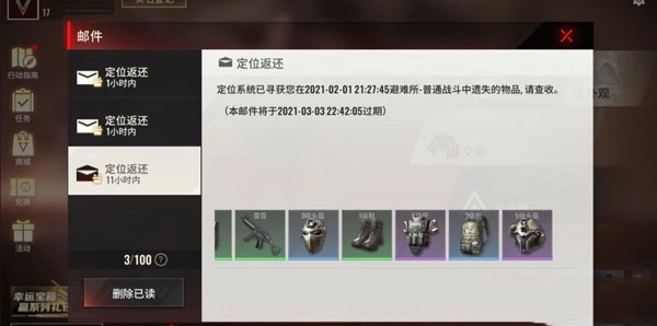 这样进入下一盘战斗后,即便不小心撤离失败,若定位的装备没有被人捡走的话,砖友们就会在邮件里收到组织送回的装备。砖友们一定不要破罐子破摔,万一真就没人捡走,岂不是血赚?