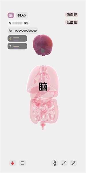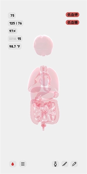 8、屏幕右上角显示的是该人体模型的异常状态,比如此刻,她正处于低血钾和低血糖的状态。