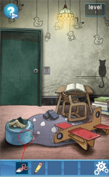 1、首先进入第一关,点击拾取地面上的剪刀以及木桌上的铅笔。
