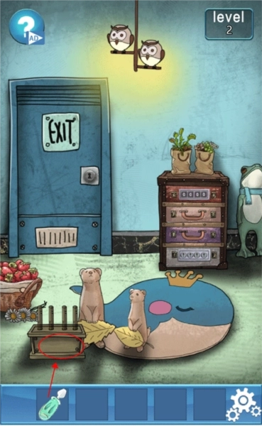 1、点击图中所示位置里小动物手中的螺丝刀,接着用这把螺丝刀打开左下角的柜子。