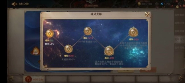 需要手动点击激活,激活界面显示的魂纹数量即为魂灵上魂纹属性的总条数;举个例子,若我总共镶嵌了4个魂灵,魂纹属性加起来有5条,就能激活第一个魂灵大师了。