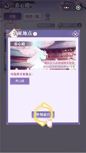 3、任务提示:点击屏幕上的“养心殿”选项,接着点击“即刻前往”按钮,就能直接进入养心殿场景了。