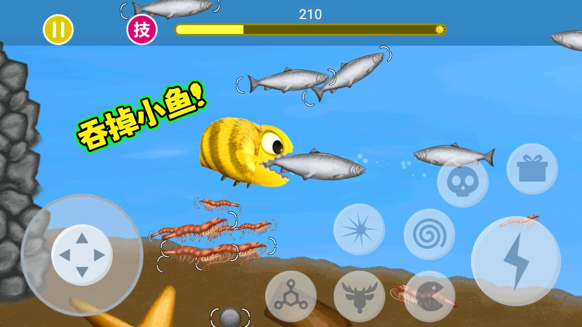2.成长机制:通过吞噬积累的能量能够解锁全新形态,幼鱼会逐步进化为大型掠食者,进而开启难度更高的区域。