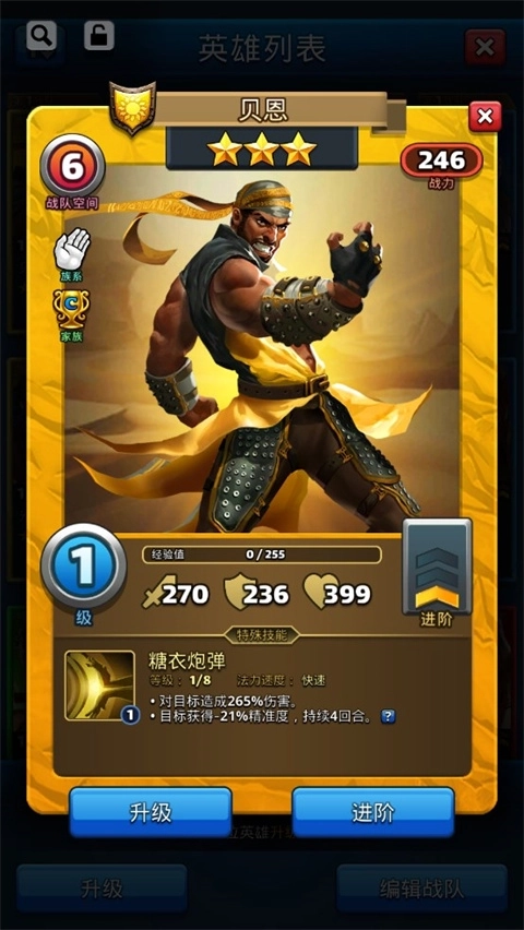 在这里我们能够看到英雄的当前等级、经验值、自身三维属性(攻击、防御、生命值)以及特殊技能的详细说明。