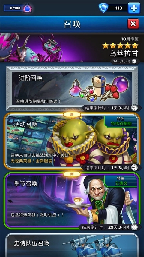 接下来是第一行的活动抽取环节,这里会提供限时英雄或特殊英雄让玩家抽取(偶尔也会有单一属性抽取之类的形式);epictroop属于小兵抽取,这类小兵会直接影响消除格的伤害输出以及英雄属性的强化效果等,在此抽取的小兵星级范围是3到4星。小兵同样支持升级,但需要等主城等级达到10级后,通过转化部分特定的5级以上建筑来实现升级操作(目前我暂时没有升级小兵的计划,主要原因是我的小兵大多是2到3星,而且食物资源比较紧缺)。
