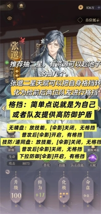 道同盘能将自身格挡效果转化为全员格挡,一星的也可以保留。在李傕那关,即便没有王粲、张郃和荀彧,单靠张邈的格挡也能撑过去。