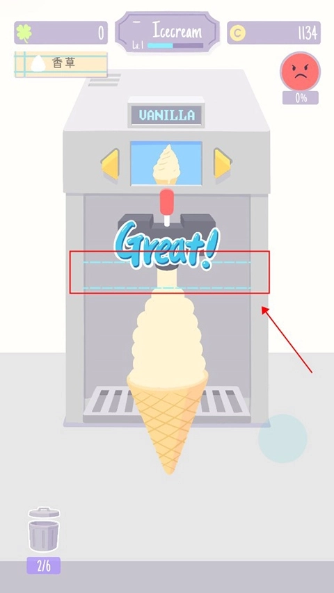 4、接着加入合口味的冰淇淋,把甜筒放进冰淇淋机,长按屏幕,等蓝线出现就能停止,要是没及时停就会制作失败,得丢到左下角垃圾桶重新做。