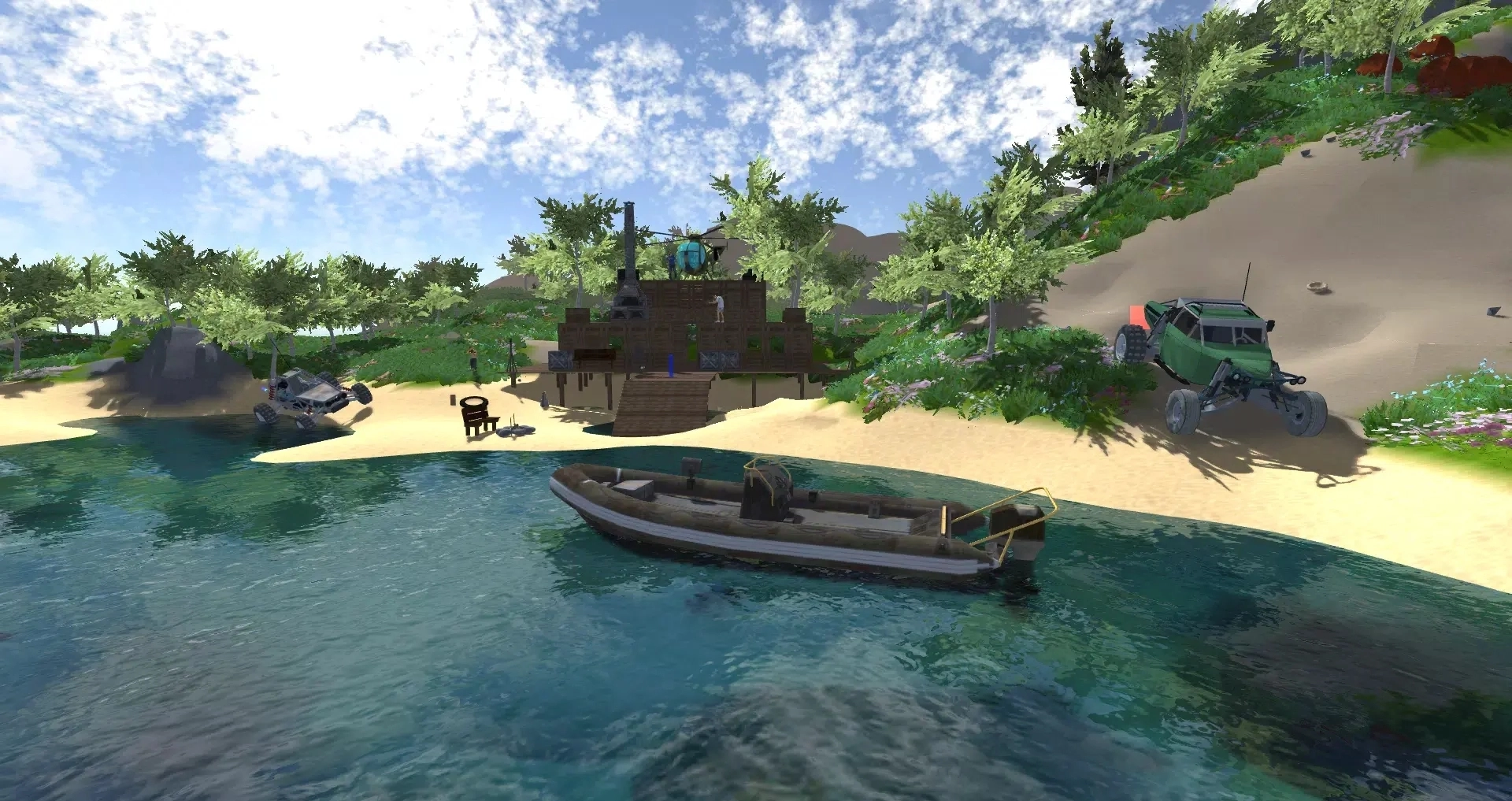 生存技能体系涵盖超50种可解锁能力,从基础的采摘、烹饪到高阶的陷阱制作、环境改造,每项技能都贴合真实生存逻辑——初期可依赖香蕉充饥,中期掌握壁炉烤肉技艺,后期更能搭建全自动农场达成食物自主。建筑系统则支持无限制创作:破坏任意地形获取资源,建造多层楼宇、地下要塞,甚至打造配备家具的奢华别墅;独特的“模块化建筑”机制还允许玩家将卡车、轮船、直升机等交通工具整合进基地,构建移动堡垒。
