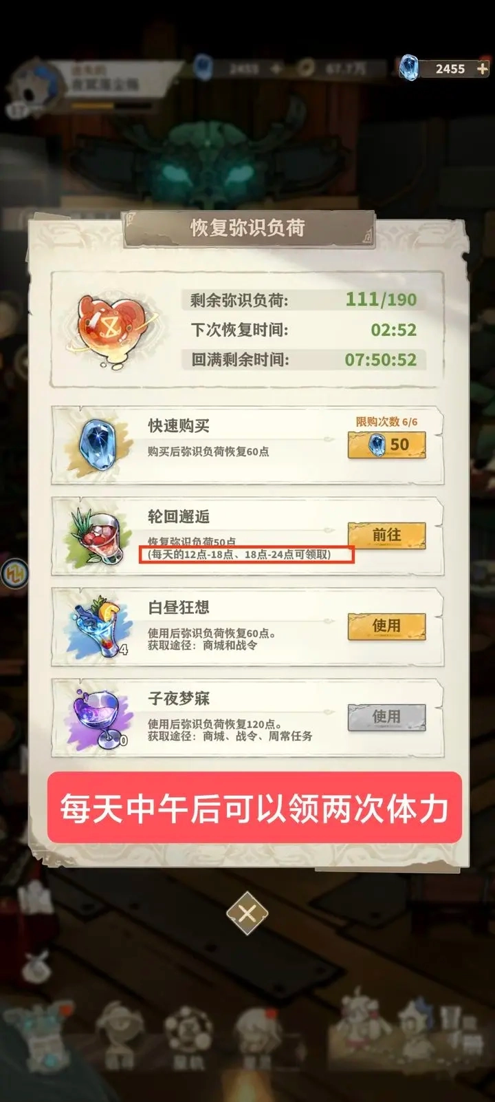 每日有两次领取体力的日常任务,领取位置在首页右上角。当领取时间到了,那里就会出现小红点提示。每天通过这两次领取总共能获得100体力哦!