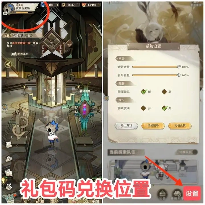 兑换码的位置在左上角游戏名称进入的设置里(目前我获得的唯一兑换码是通过加群找管理领取的一次抽奖机会)