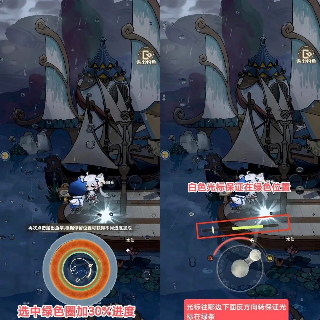 钓鱼的时候一定要把圈缩到那个带30%加成的绿色圈上,之后进入钓鱼界面就让光标稳稳地停在绿条里,这样能更快把鱼钓上来……