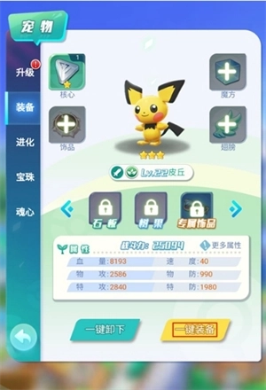 还可以给宠物一键穿戴装备,大幅提高宠物属性。