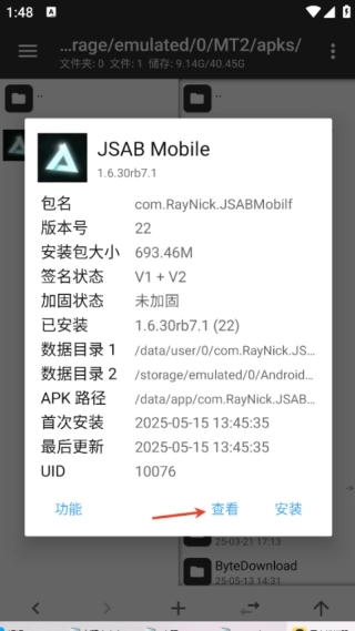 6、接下来在右侧文件列表中依次点击Android、data、com.RayNick.JSABMobilf、files,最终界面呈现如下。