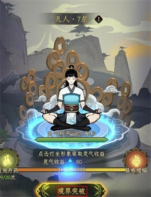 6、记住提升角色修为很很重要的,为此还得收集更多的灵气,一旦满了就可以突破境界。