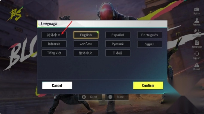 1、进入代号血战后,在登录界面点击右侧的language选项。