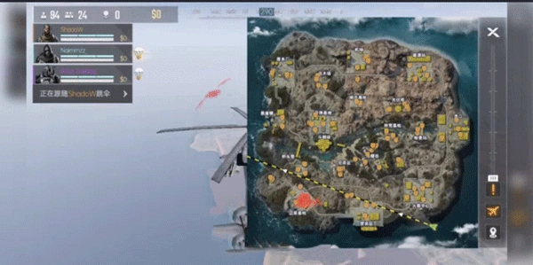 3、调整完毕后,玩家会与自己的三人小队,和其他玩家一同乘坐同一架飞机前往一座孤岛,展开大逃杀游戏。