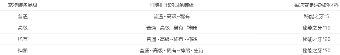 宠物装备词条品级分5种:白色普通、蓝色高级、紫色稀有、粉色神器、黄色史诗