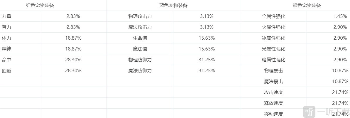 在变更宠物词条时,不仅等级会发生变化,词条的属性同样会随机改变。并且,三个部位的宠物装备词条各自具备不同的属性。