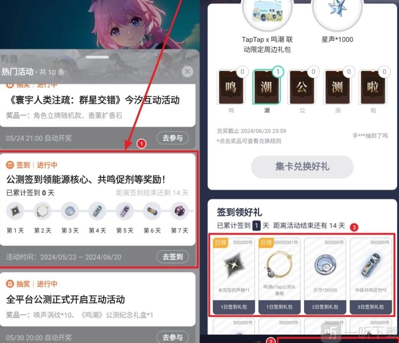 活动期间,在taptap里打开鸣潮游戏页面,点击左下角的礼包图标,就能找到签到活动,每天签到可获取对应奖励。